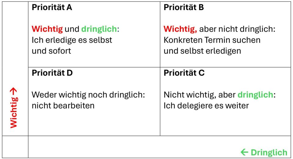 Wenn eine Aufgabe für Ihre Zielerreichung (z.B. Abschluss einer Ausbildung) wichtig und dringend ist (die Prüfung ist übermorgen), dann hat sie Priorität A und sollte von Ihnen selbst möglichst rasch erledigt werden. Das könnte auch z.B. ein Vernetzungstreffen mit wichtigen Kund*innen sein, die Ihnen bis zu einem gewissen Termin ein Angebot vorgelegt haben.