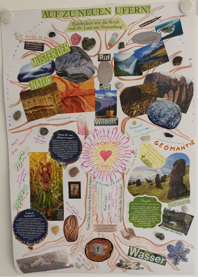 Nicht selten findet sich Ihr zentrales Thema in der Mitte des Visionboards. Finden Sie Ihre wichtigen Themenbereiche wieder? Wo sind sie auf dem Bild? Wenn sich Themen wiederholen, weist das vielleicht auf ihre Bedeutung für Sie hin.