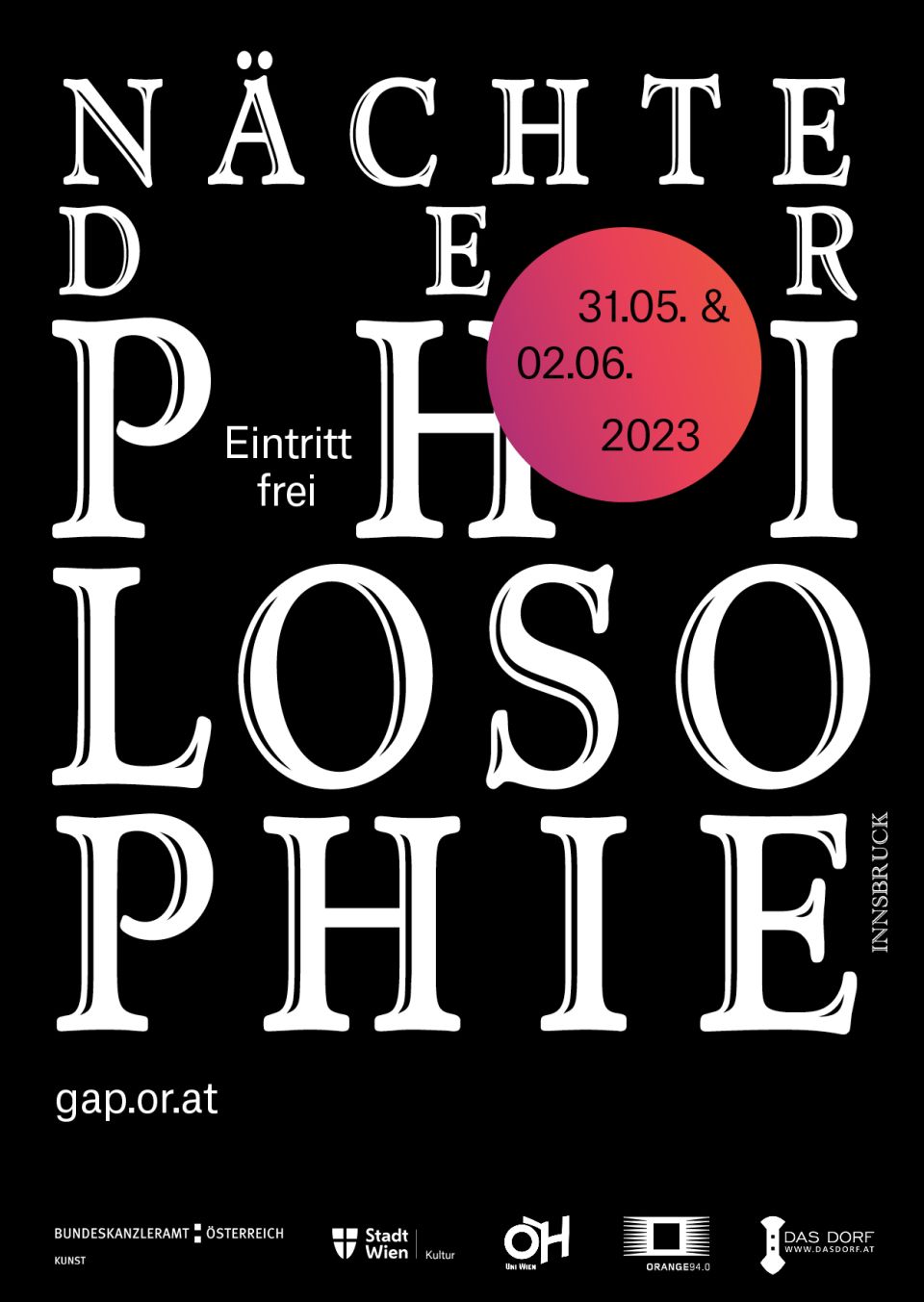 Vom 31. Mai bis 4. Juni 2023 finden in Wien, Graz und Innsbruck wieder die "Nächte der Philosophie" statt. Ich biete dieses Mal am 31. Mai um 18 Uhr einen philosophischen Spaziergang auf den Spuren von Montaigne und Camus in Innsbruck an.